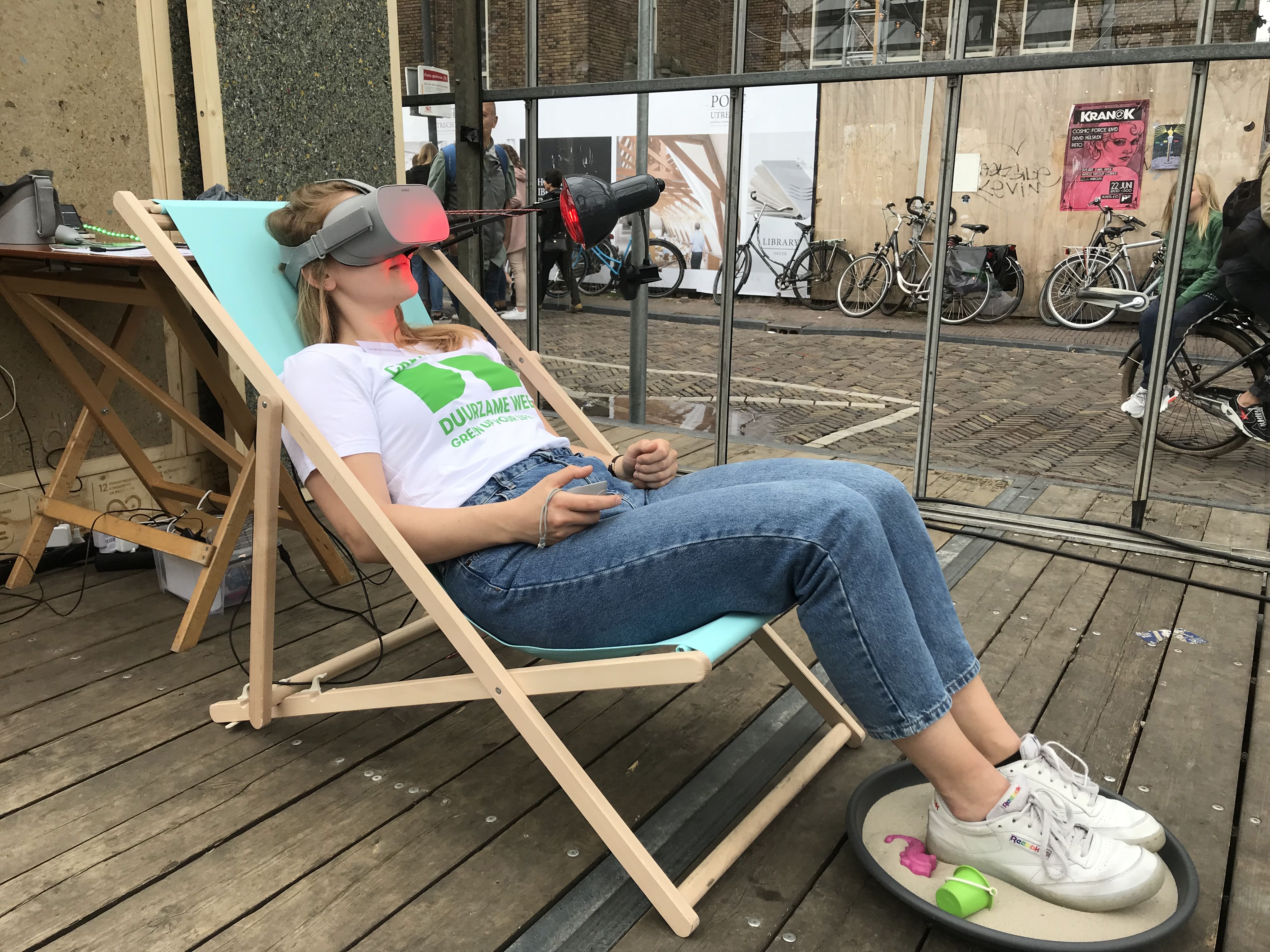 Met de VR strandstoel op reis naar een mooi strand. Even weg uit deze omgeving, zonder weg te gaan. En zonder aankoop van een klimaat-neutraliserend boompje ergens op de wereld.