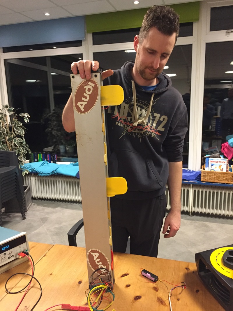 Bevestiging van de Tilt-sensors aan het scroreboard en detail van de werkende Tilt-sensors die een puls doorsturen naar de Arduino en het LoRa Netwerk.