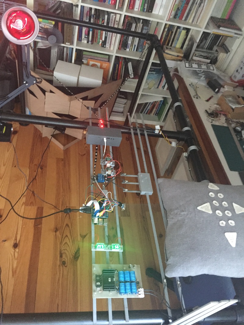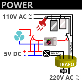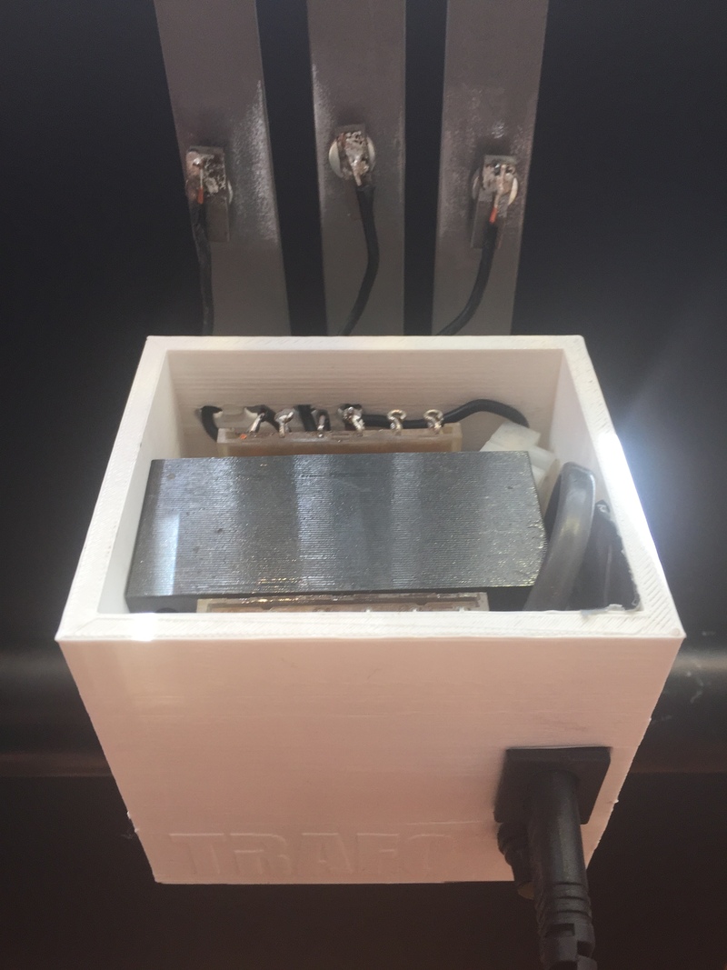 De Transformator zorgt, naast de 5 Volt gelijkstroom die nodig is voor alle apparaten, ook voor de stroom naar het smartglass en de warmtelamp. Dit is 110 Volt wisselspanning. Niet gevaarlijk, maar is qua schol vergelijkbaar met schrikdraad....