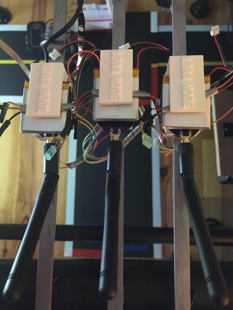 Een andere nieuwe technologie om kleine hoeveelheden data over lange afstand te versturen heet LoRa. De LORA Gateway met 3 Nodes die data vanuit de installatie kunnen doorgeven. Toepassing voor temperatuurmeting of dat de zelfrijdende auto de parkeerplaats heeft bereikt... Bijna alle sensoren kunnen aan de node (radio) worden gekoppeld en geven hun data dan via lange afstand, zonder veel stroomverbuik door aan de Gateway.