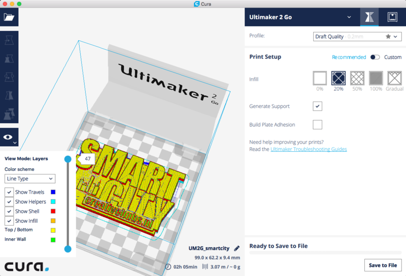 De witte onderdelen zijn zelf via SketchUp ontworpen en 3D geprint. De Cura-software zet vervolgens de 3D-STL-files om naar GCode, een script dat de 3D vorm omzet naar lagen voor een 3D-printer.