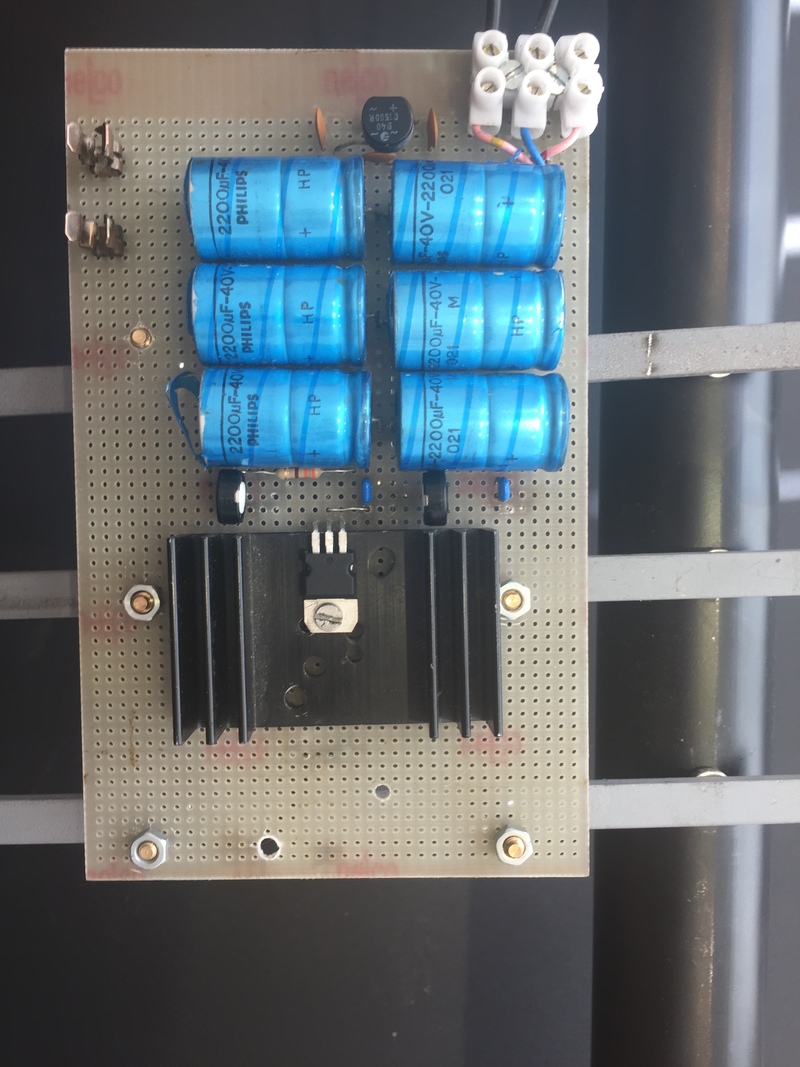 Power Transformator (links) die de stroom verzorgt voor de installatie. De wisselspanning wordt omgezet naar gelijkspanning (rechts). De metalen geleiders verspreiden de stroom naar alle apparaten.